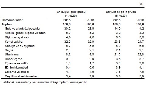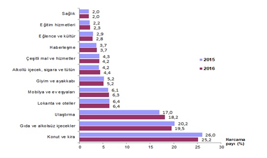 Giyim ve ayakkabı (%5,2), sağlık (%2), haberleşme (%3,7) ile lokanta ve otel (%6,4) harcamalarının payı ise 2016 yılında da değişmedi.